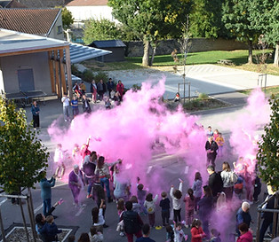 vendredi 17 octobre, joli lancé de poudre rose avec les enfants de l'école de Rully à la veille de la Marche Rose organisée par la municipalité.